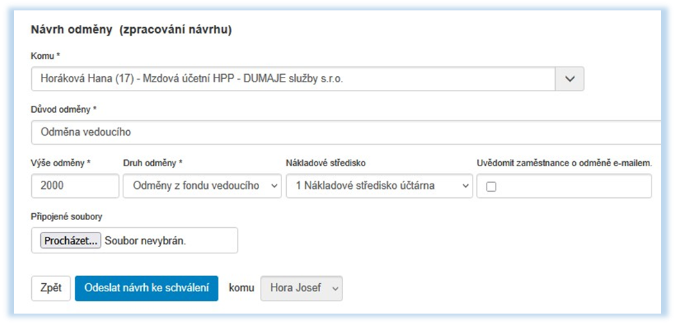 Na stránce Návrh odměny (zpracování návrhu), na kterou se dostanete cestou Odměny / Návrhy odměn / tlačítko Navrhnout odměnu, se po výběru zaměstnance v položce Komu předvyplní položka Nákladové středisko podle nákladového střediska, které je dáno pracovní pozicí zaměstnance.