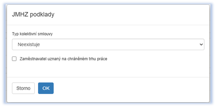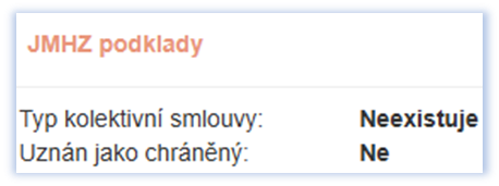 Prostřednictvím volby Nastavení / Číselníky a nastavení / Registrace zaměstnavatele u institucí je dostupný formulář/stránka Registrace zaměstnavatele u institucí. Do tohoto formuláře byla přidána sekce JMHZ podklady, kde se řeší nastavení kolektivní smlouvy a také zda je zaměstnavatel uznaný na chráněném trhu práce.