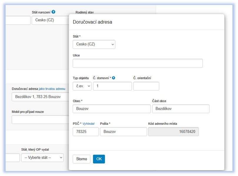 Po kliknutí na tlačítko Storno ve formuláři pro zadávání adresy dojde v Osobním dotazníku ke správnému naplnění pole pro automatické doplnění adresy.