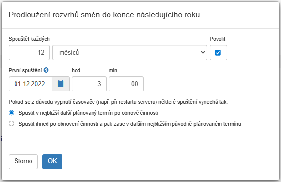 Chcete-li využívat tento způsob, povolte naplánovanou úlohu pro automatické prodlužování rozvrhů směn a nastavte režim jejího spouštění. Program pak bude udržovat rozvrhy směn stále aktuální.