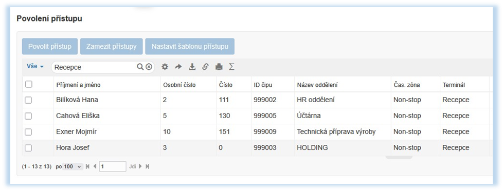 Došlo k úpravě dotazu pro zobrazení záznamů v seznamu na stránce Povolení přístupu (Nastavení / Číselníky a nastavení / Docházka / Terminály / odkaz Povolení přístupu u řádku v seznamu), tak aby počet záznamů u odkazu Povolení přístupu odpovídal počtu záznamů pro určený terminál na stránce Povolení přístupu. Úprava řeší případ, kdy u zaměstnance není zadáno oddělení (např. dohody).