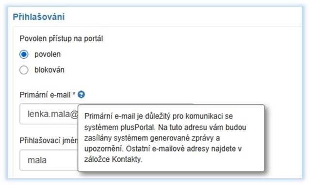 - Každý uživatel s aktivním přístupem do systému plusPortal má ve svém uživatelském profilu evidován e-mail, na který mu systém posílá zprávy a upozornění. Tento e-mail je označen jako Primární e-mail. Zadává se v Kartě zaměstnance, v sekci Přihlašování na záložce Přístupy a práva. Byl upraven nadpis a komentář k položce Primární e-mail v Kartě zaměstnance. Na stránkách, kde se vyskytuje odkaz na tento e-mail byla upravena lokalizace tak, aby se používal název Primární e-mail.