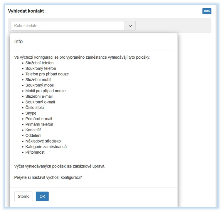- Pro uživatele s oprávněním Personalistika - nastavení bylo na stránce Osobní informace / Vyhledat kontakt doplněno tlačítko Info, které umožňuje zobrazit modální panel, který obsahuje seznam vyhledávaných položek pro výchozí konfiguraci a možnost tuto konfiguraci použít.