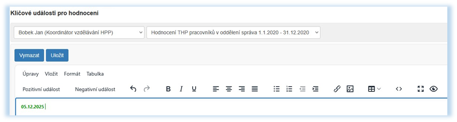 Na některých stránkách systému plusPortal je použitý nástroj pro formátování textu. Tento nástroj byl modernizován a v souvislosti s tím došlo i k úpravě na stránce Hodnocení / Klíčové události, kde bylo přemístěno tlačítko Uložit vedle tlačítka Vymazat (dříve bylo uvnitř prvku). Tlačítka Pozitivní událost a Negativní událost zůstala uvnitř prvku, ale nyní se zobrazují bez zeleného resp. červeného pozadí.