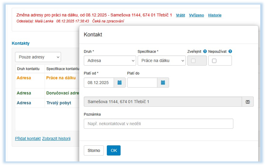 - V Kartě zaměstnance / na záložce Kontakty - pokud existuje požadavek na změnu adresy, po kliknutí na odkaz Přidat kontakt se otevře panel s adresou předvyplněnou podle požadavku.