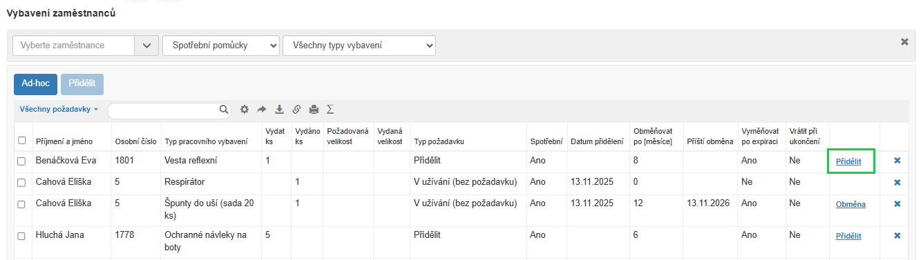 - Pro hromadné přidělení přejděte na stránku Vybavení zaměstnanců (Pracovní vybavení / Vybavení zaměstnanců) a nastavte filtr v záhlaví na Spotřební pomůcky.