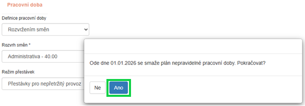 - Poté znovu uložíte nové nastavení pracovní doby a při tom vám systém nabídne, že smaže původní nepravidelný rozvrh – to vždy potvrďte, jinak vzniknou duplicity dnů v docházce.
