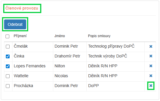 - Na stránce Pracovní doba / Provozy odeberte zaměstnance z původního provozu (buď hromadně označením zaměstnanců + tl. Odebrat nebo použijete ikonu