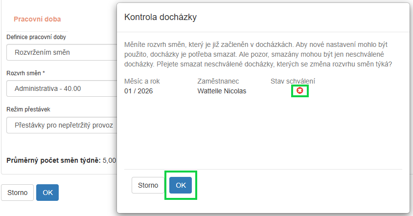 Při uložení se většinou zobrazí kontrola na existující docházku. Tu potvrďte, systém si tak zařídí výmaz docházky. Důležité je, aby docházka nebyla nikým schválená - neschválené docházky jsou označeny červenou ikonou