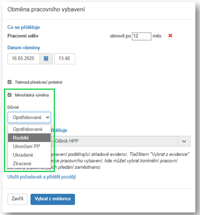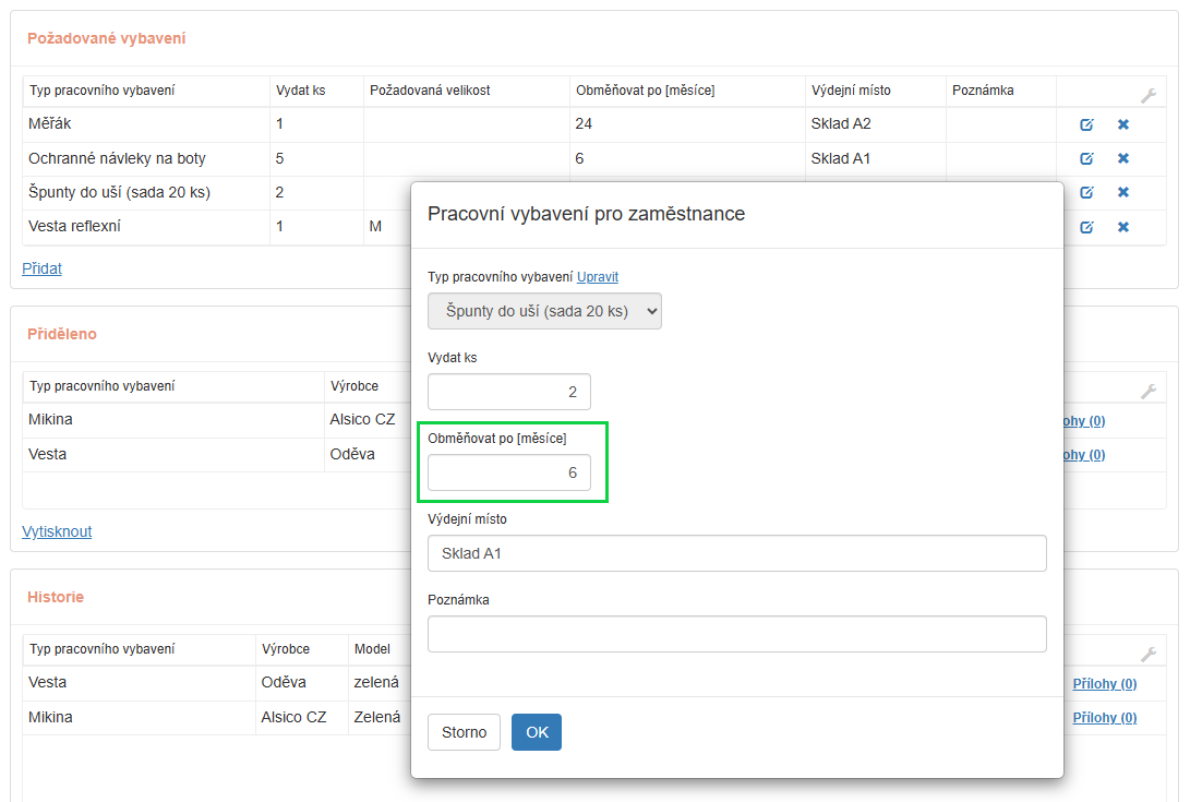 Jakmile je zaměstnanci vydána pomůcka s nastavenou pravidelnou obměnou, systém automaticky vypočítá datum příští výměny (datum přidělení + lhůta pro obměnu). Toto datum nelze ručně upravit.