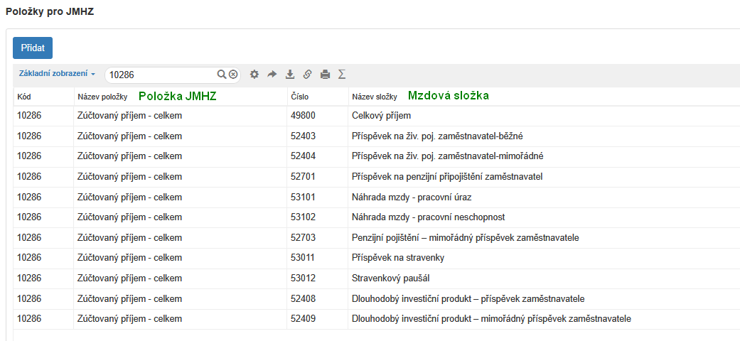 Principem je, že pro jednu položku JMHZ můžete napojit 0-n vašich mzdových složek. Konkrétní položka v číselníku pak může vypadat takto: