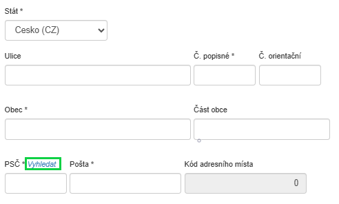 Pro vyplnění pole PSČ je možné využít vyhledávač směrovacích čísel. Zrychlené vyhledávání PSČ je možné využít tehdy, máte-li naplněn číselník Poštovní směrovací čísla (Nastavení / Číselníky a nastavení / Základní modul / Poštovní směrovací čísla).