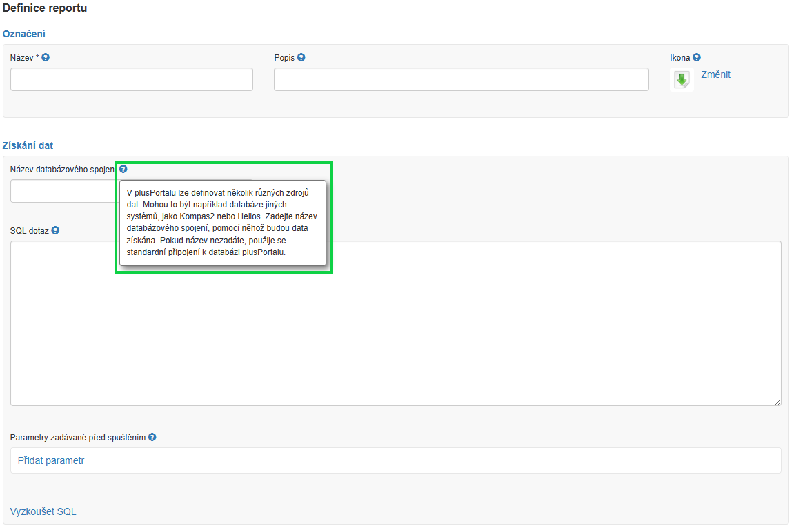 Na této stránce je také umožněno nadefinovat si vlastní report pomocí SQL dotazu. S jeho vytvořením Vám může pomoci nápověda (tooltip) u každé z položek v definici reportu.