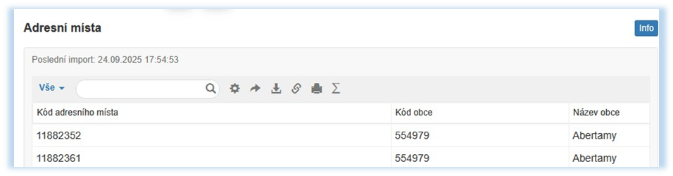 Současně byl do základního modulu doplněn číselník Adresní místa. Aktualizace dat v tomto číselníku se provádí automaticky spuštěním naplánované úlohy Import adresních míst. Každé adresní místo je jednoznačně identifkováno kódem adresního místa podle registru RÚIAN.