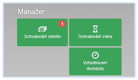 Nově dlaždice Schvalování odměn obsahuje indikátor (číslo) ukazující, kolik odměn čeká na schválení. Indikátor se objeví v případě, že má přihlášený uživatel alespoň jednu odměnu, kterou je třeba schválit.