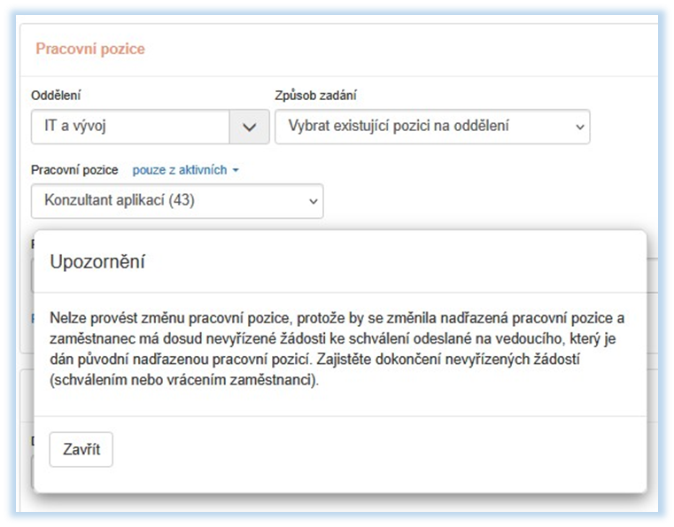 Při změně aktuálně platného pracovního zařazení zaměstnance na kartě (Zaměstnanci / HR panel / Karta zaměstnance / záložka Pracovní poměr / sekce Pracovní zařazení), u kterého je jiná nadřízená pracovní pozice a zaměstnanec má dosud nevyřízené žádosti ke schválení odeslané na vedoucího, který je dán původní nadřízenou pracovní pozicí, bylo doplněno upozornění. Lokalizované upozornění se tedy zobrazí, pokud má zaměstnance nevyřízené žádosti odeslané ke schválení původnímu vedoucímu.