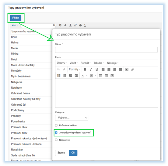 K jednotlivým položkám pracovního vybavení je možné nově zadat také požadavek na velikost a výběr z kategorie, přičemž o kategorie pracovního vybavení byly rozšířeny číselníky pracovního vybavení a slouží pro nadefinování druhů pracovních pomůcek.