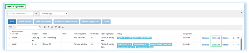 V Seznamu vybavení přibylo na řádku u každého typu pracovního vybavení tlačítko Přílohy, kam se ukládá veškerá evidovaná dokumentace k danému zařízení (návody, záruční listy, kalibrace, atd.).