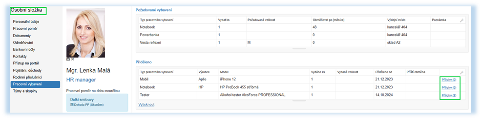 Zaměstnanec má tuto dokumentaci k dispozici ve své Osobní složce a může si ji jednoduše zobrazit také přes tlačítko Přílohy.