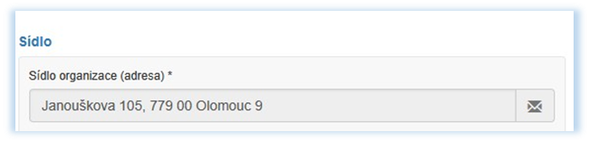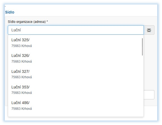 Pokud je naplánovaná úloha Import adresních míst povolena a alespoň jednou již tato úloha proběhla, na níže uvedených stránkách je možno zadat adresu pomocí automatického doplnění tak, že do editačního pole zadáte část textu adresy. Systém poté zobrazí rozbalovací nabídku, ze které vyberete správnou položku. V rozbalovací nabídce je prvních 20 položek, které analyzátor textu adresy nalezne. Adresu pro automatické doplnění se doporučuje zadávat v pořadí: Ulice, Číslo popisné, Obec, případně Obec, Číslo popisné.