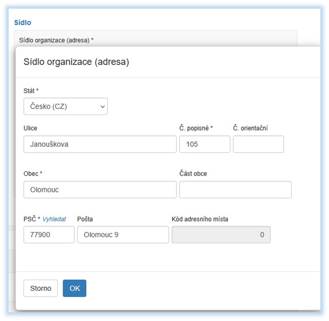 Pokud se jedná o adresu, která není v ČR nebo adresa není v rozbalovací nabídce, lze adresu zadat ručně v modálním panelu, který se zobrazí po kliknutí na odkaz s poštovní obálkou umístěný na konci editačního pole pro adresu.
