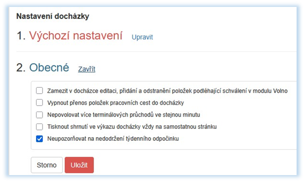 Kontrolu nedodržení týdenního odpočinku lze uživatelsky vypnout na stránce Nastavení / Číselníky a nastavení / Docházka - nastavení v sekci Obecné, zatržením položky Neupozorňovat na nedodržení týdenního odpočinku.
