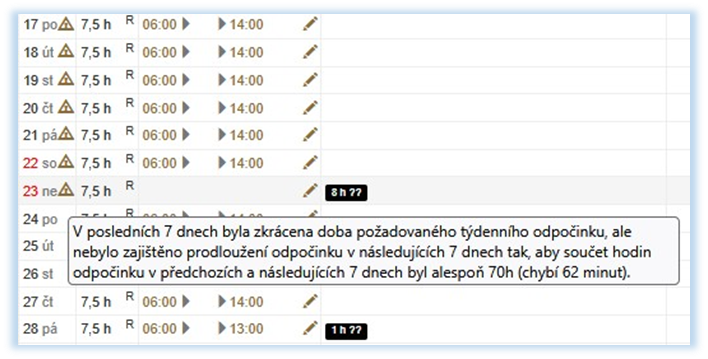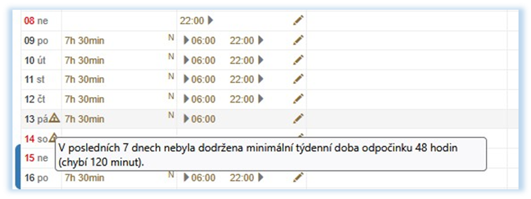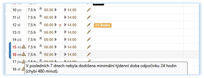 Zároveň byla provedena úprava na stránce Docházka / Vyhodnocení docházky / detail docházky. Pokud není dodržena dostatečná délka nepřetržitého odpočinku v týdnu, zobrazí se v řádku pro odpovídající den výstražný indikátor