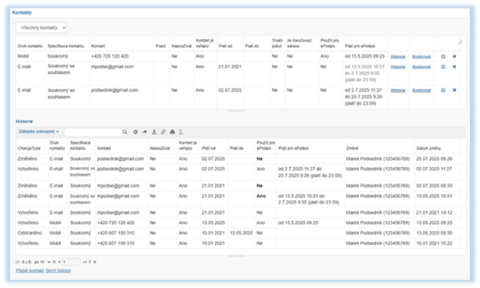 V kartě zaměstnance v záložce Kontakty bylo doplněno logování změn a sledování historie platnosti kontaktů. V seznamu kontaktů přibyl odkaz Historie. Veškeré změny kontaktů, ať už jde o přidání nového, úpravu nebo odstranění stávajícího kontaktu, se nyní zapisují do seznamu změn, včetně typu změny a jaký uživatel a kdy změnu provedl. U změněných kontaktů budou dále tučně zvýrazněny údaje, které se u kontaktu změnily. Tento seznam je dostupný v kartě zaměstnance na záložce Kontakty po kliknutí na odkaz Zobrazit historii. Dále je seznam změn možné zobrazit pouze pro konkrétní kontakt kliknutím na tlačítko Historie u požadovaného kontaktu. Do seznamu změn se propisují i změny kontaktů provedené mimo plusPortal, tedy například načtené pomocí datové pumpy z jiného systému, apod.