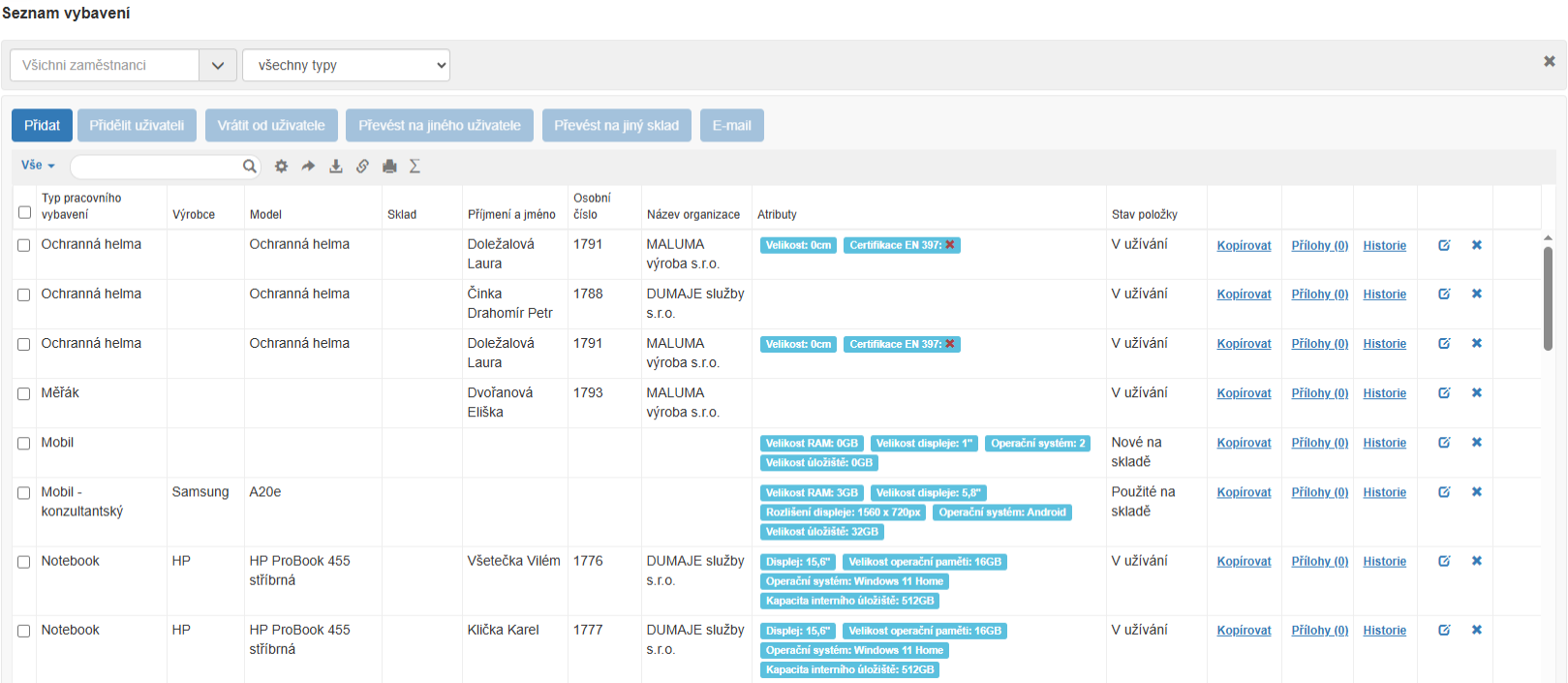 - Přidělené - pracovní vybavení s nastaveným uživatelem (vybavení je aktuálně přiděleno uživateli).