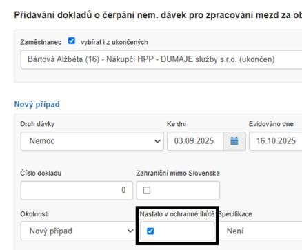 - V detailu nemoci označíte Nastalo v ochranné lhůtě.
