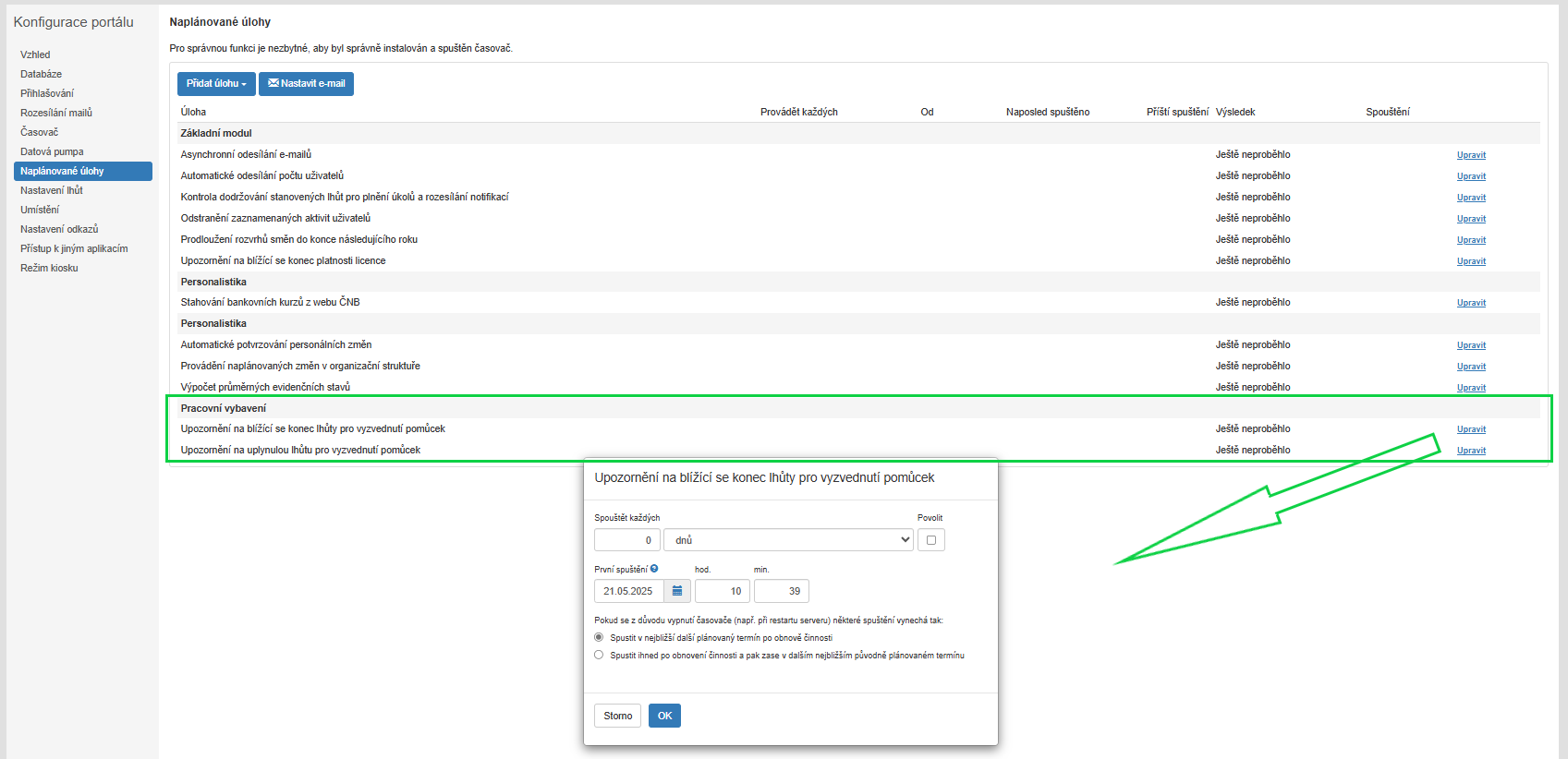 - Budete-li chtít využívat funkci obměny vybavení, včetně automatického zasílání upozornění na blížící se konec lhůty pro vyzvednutí pomůcek, případně zasílání upozornění na uplynutí lhůty pro vyzvednutí pomůcek, proveďte nastavení naplánované úlohy (Nastavení / Konfigurace / Naplánované úlohy).